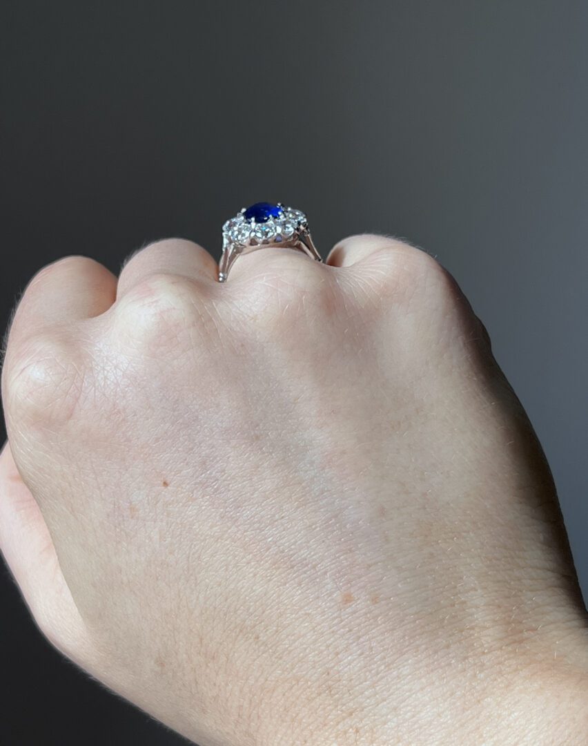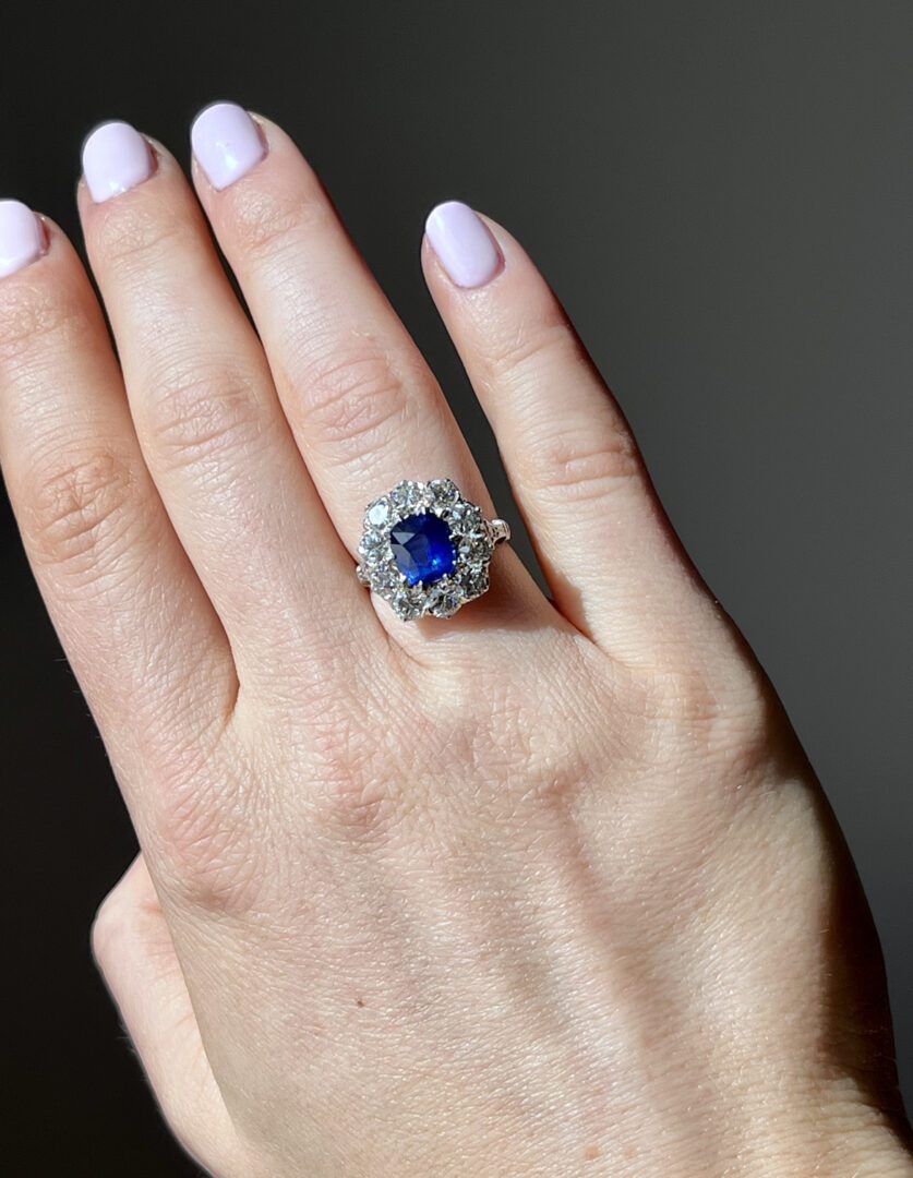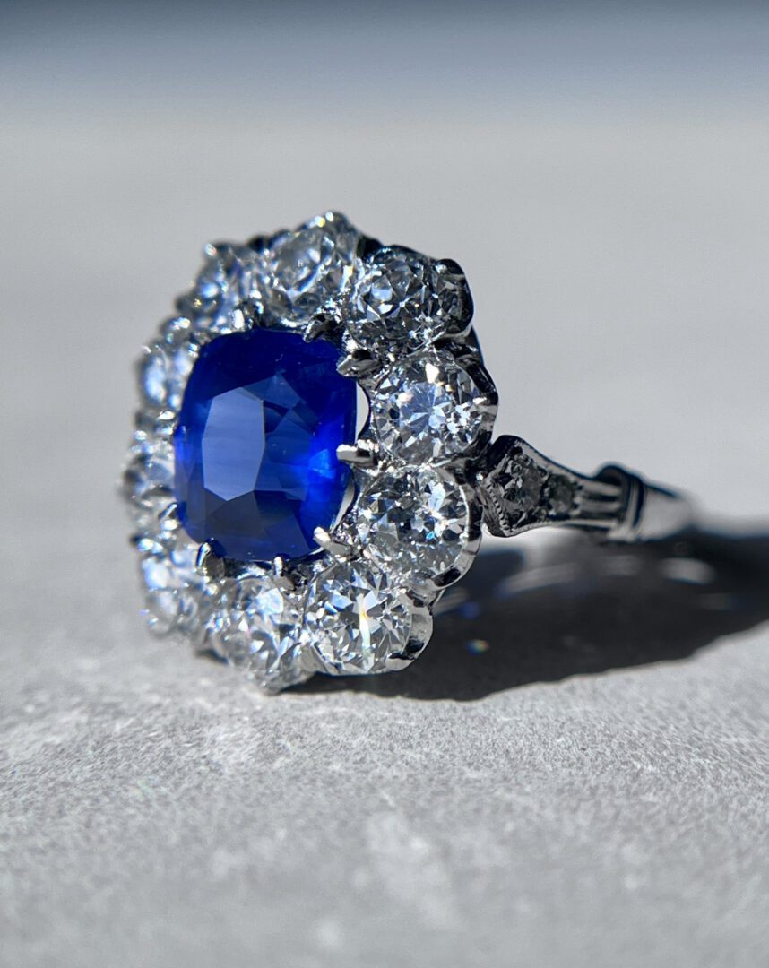 This exceptional ring showcases a fine Ceylon sapphire. This richly saturated royal blue sapphire weighs approximately 2.15 carats. The center stone is encircled by a dazzling halo of old European cut diamonds, each weighing approximately 0.20 carats, for a total diamond weight of about 2.00 carats.
