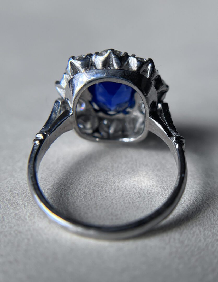 Crafted in platinum, the setting features delicate diamond accents along the shoulders, enhancing the ring’s elegance from every angle. The proportions of sapphire to diamond are nothing short of perfection—striking a visual balance that is both bold and refined. A truly remarkable piece, destined to be a treasured heirloom.