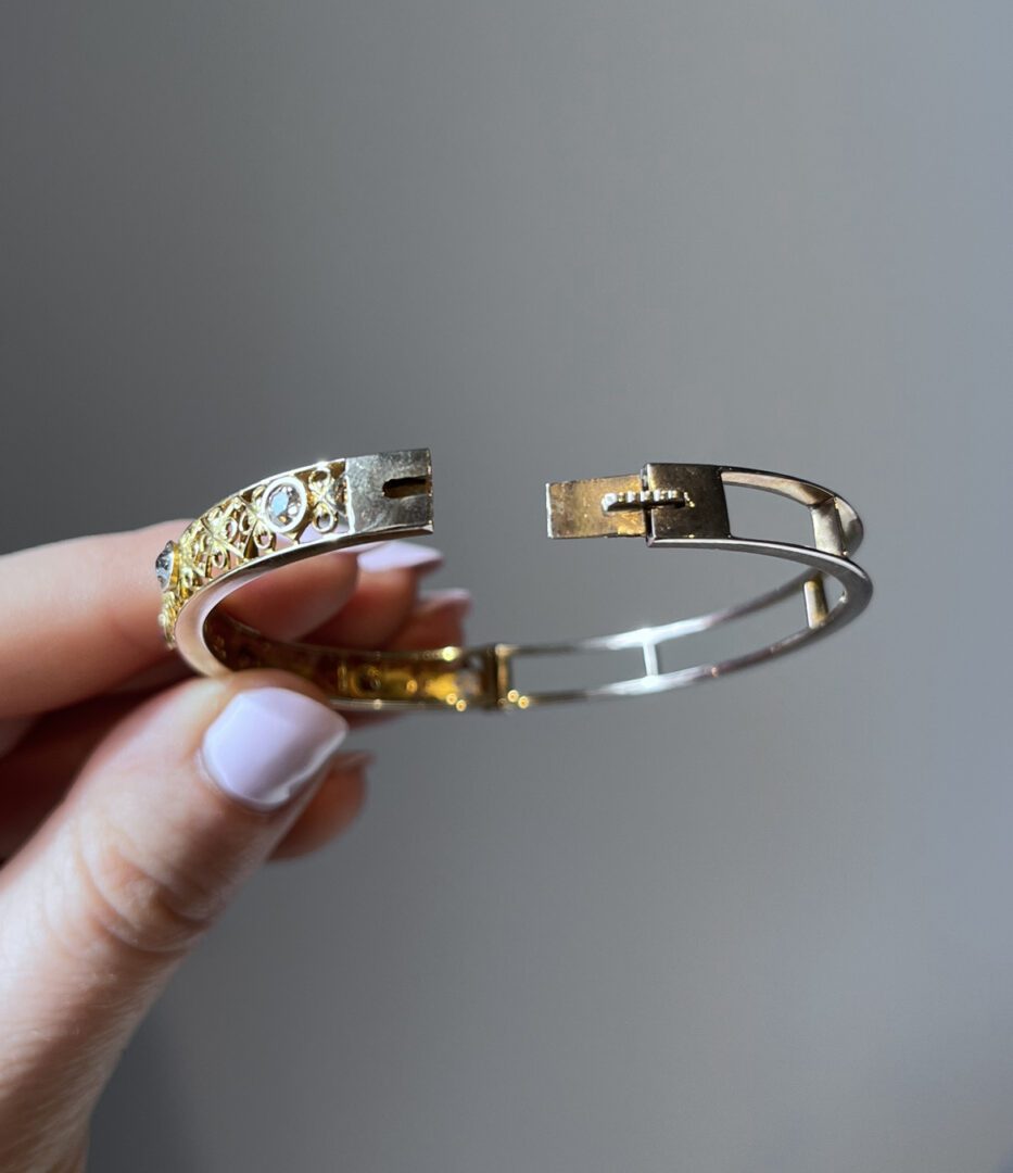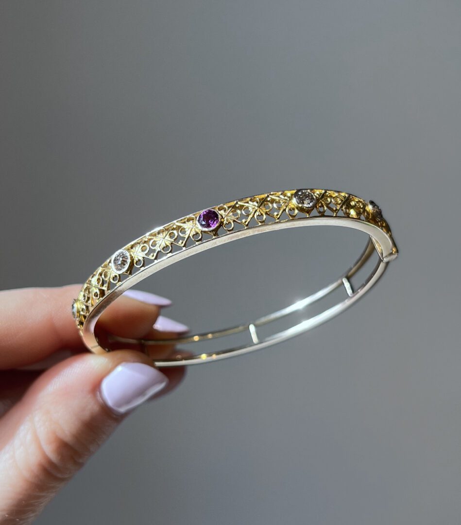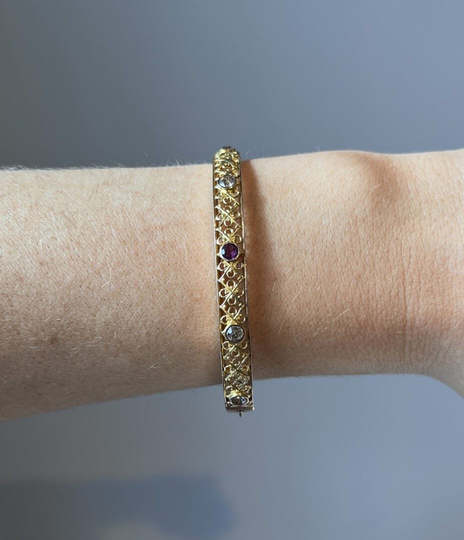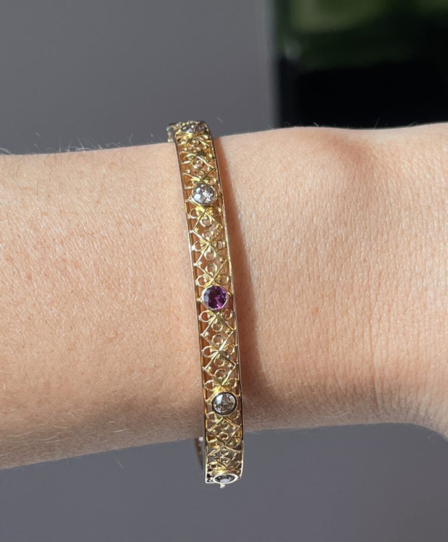 This antique bangle displays an intricate latticework pattern sculpted directly into the gold. The piece is accented with four warm, champagne-hued old European cut diamonds and a single purplish-red ruby, all bezel-set for a seamless, elegant finish. The bangle hinges open for effortless wear and closes securely, making it as practical as it is beautiful.