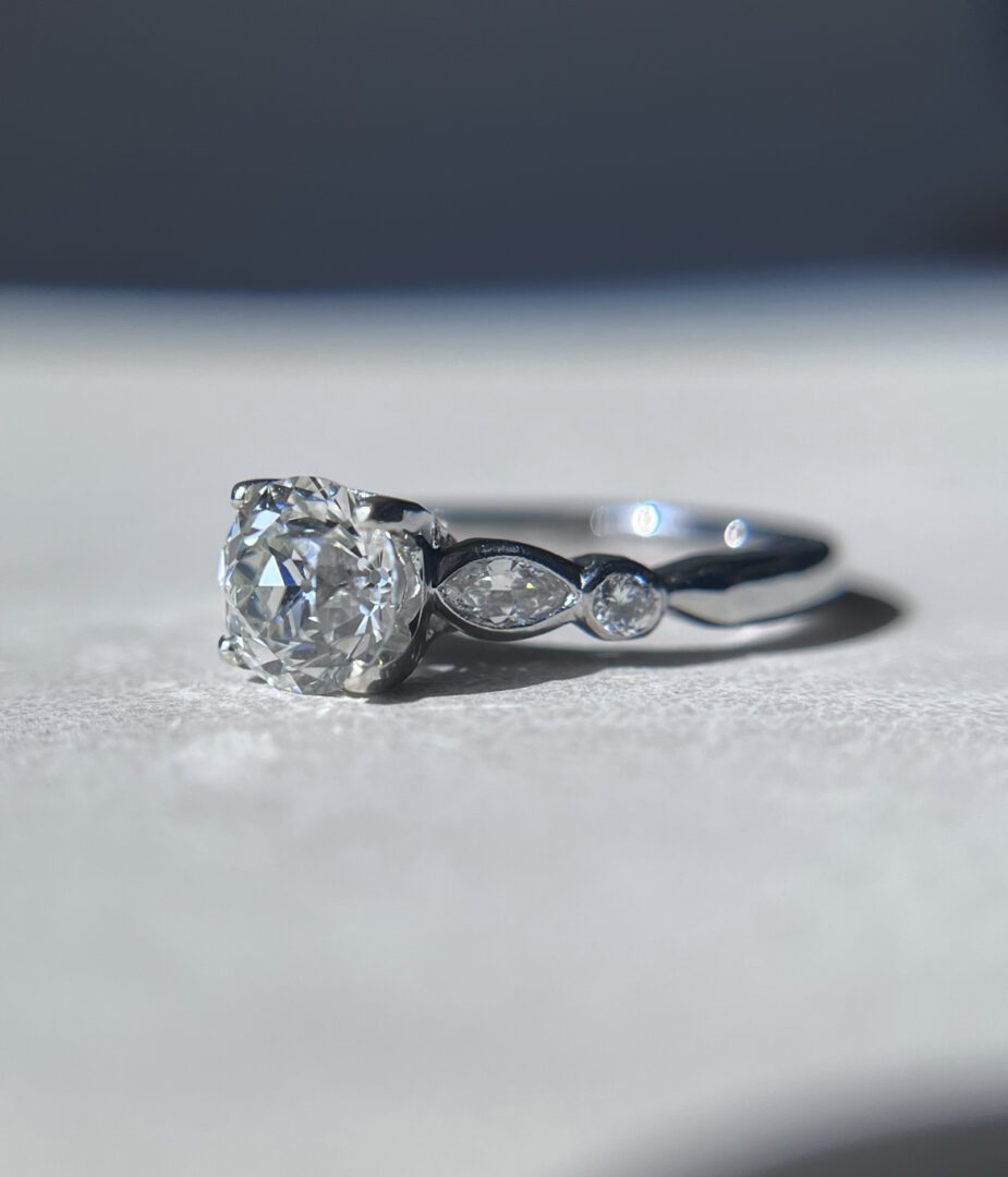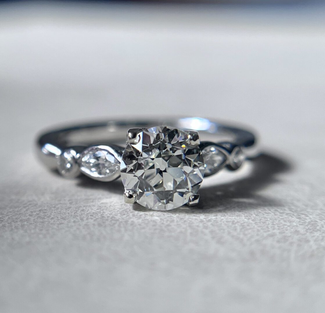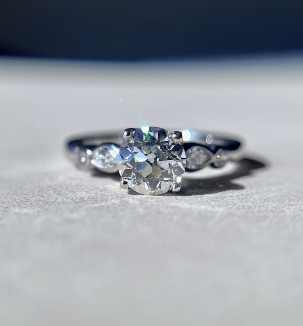This exquisite early 20th-century ring showcases a luminous 1.26-carat Old European cut diamond at its center, graded I color and VVS2 clarity. The diamond’s high clarity and soft, romantic sparkle make it an excellent choice for an engagement ring. Crafted in platinum, the setting is adorned with marquise and round brilliant cut diamond accents that add graceful movement and subtle brilliance to the design.